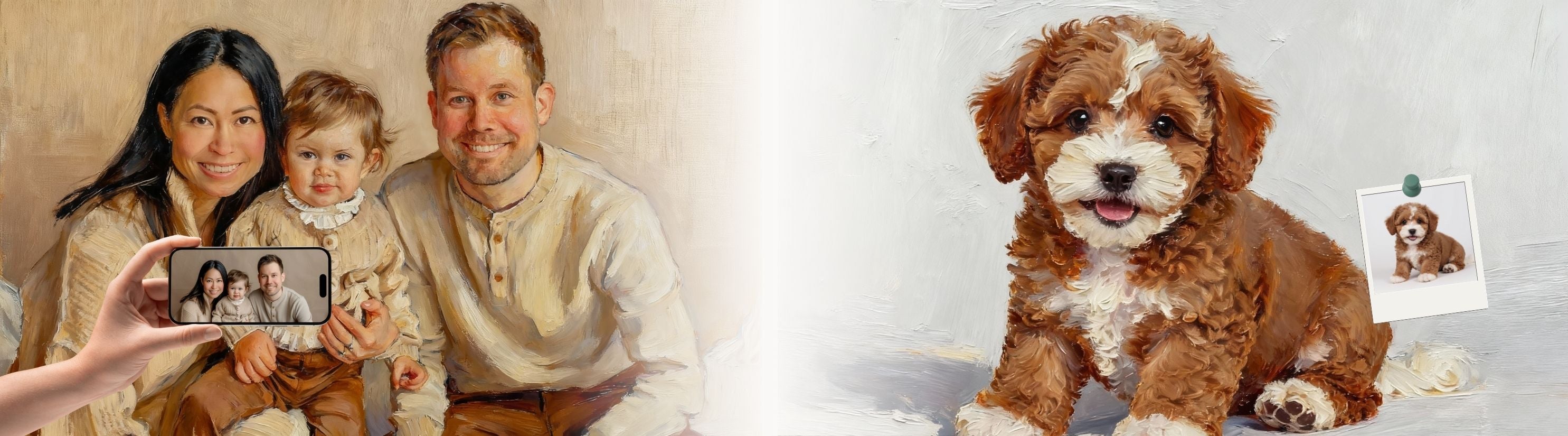 We turn your photos and favorite classics into hand-painted oil canvases. Layer by layer, our artists build real texture and light—no filters, no shortcuts—using archival materials that last.